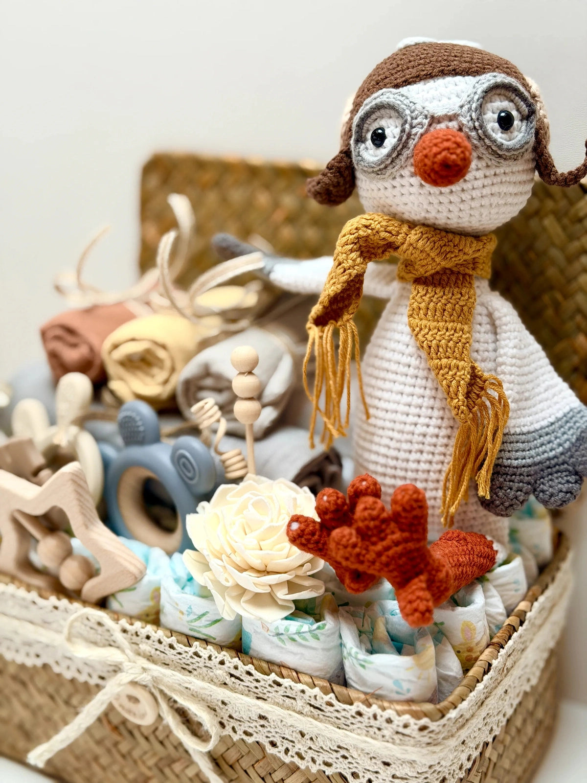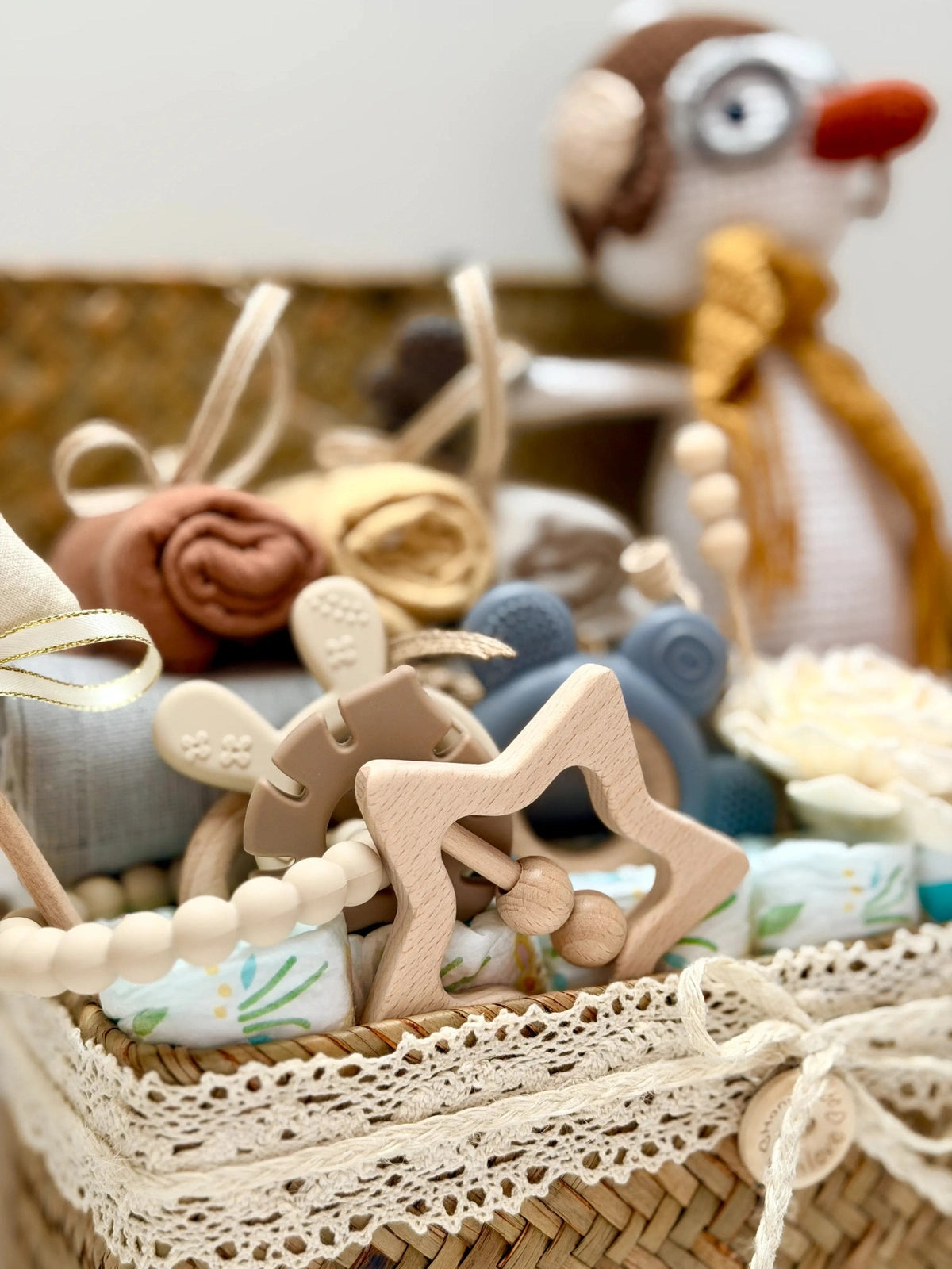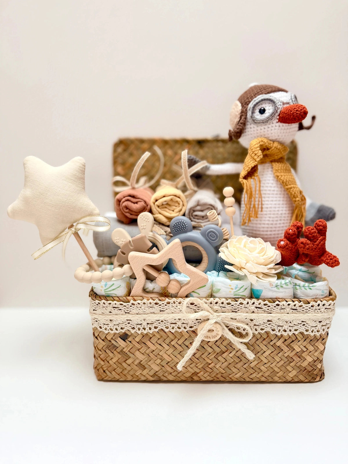 Exklusives Geschenkset zur Geburt in einem wiederverwendbaren Flechtkorb. Enthält 24 Premium-Windeln, einen gehäkelten Storch, Mulltücher, Rasseln aus Holz und Beissring-Set in harmonischer Farbabstimmung.